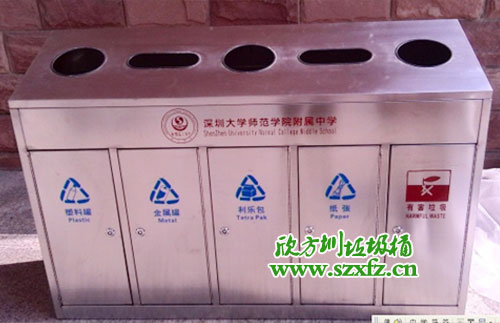 深圳師范學院附屬中學款式的C170五分類環(huán)?;厥障?/span>規(guī)格為:1600*400*860mm.外表是一款全新不銹鋼材質打造而成.不銹鋼垃圾桶頂部有五個垃圾投放組合,圓形垃圾投口分別左,右,中間,還有兩個半圓在中間部位。不銹鋼垃圾桶正面開有五個門,每一個門前都有一個小鑰匙配套開門。正面中間橫幅有LOGO的標準,還有深圳大學師范學院附屬中學字樣及英文拼音字母組合而成。不銹鋼垃圾桶五個取放垃圾內膽正門,絲印有五個垃圾投放標志。從左到右依次回收塑料罐,金屬罐,利樂包,紙張,有害垃圾及標志。不銹鋼垃圾桶外觀為方形,具有獨特的堅固耐用,不易破損;耐火安全,抗高低溫等優(yōu)勢。適合各大院校,高檔場所使用。