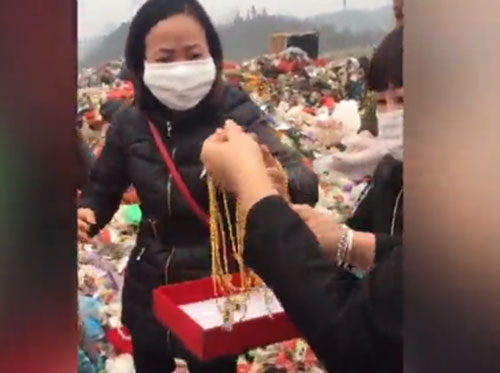 現(xiàn)場視頻顯示,7名女子在一垃圾場中捧著首飾盒正核算尋回的金項(xiàng)鏈數(shù)目,其中一黃衣女子倚靠在身旁黑衣女子肩膀上大哭。核算完項(xiàng)鏈數(shù)目后,眾人紛紛說道:“好了好了,走了走了。”