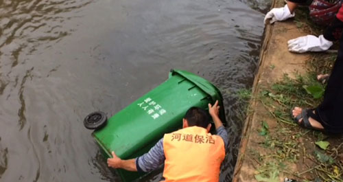 實在沒有辦法,一名環衛工人只好冒險跳進河道,把水倒掉后,費了九牛二虎之力,才把垃圾桶打撈上岸。算下來,前前后后花了一個多小時呢!