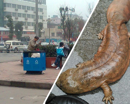 成都火車東站廣場外圍滿了人,大家都好奇地看著在地上爬來爬去的4個小家伙,它們可不是普通動物,而是國家二級保護動物——娃娃魚。它們的來歷撲朔迷離,據說是環衛工在打掃垃圾桶時,從一個塑料袋里翻出來的,究竟是何人所丟不得而知?,F在4條娃娃魚被送往成都動物園,暫未有發現不適現象。