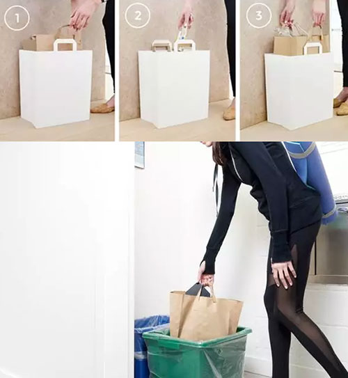 它的正確使用方式是搭配上購(gòu)物紙袋,這一點(diǎn)和我們的習(xí)慣似乎不太一樣,也許是因?yàn)槊绹?guó)購(gòu)物時(shí)使用紙袋更多,勤儉持家的家庭主婦們將這些紙袋用作垃圾袋,可是紙袋不夠牢固,放上東西便會(huì)東倒西歪,有這樣一個(gè)垃圾桶正好解決問(wèn)題,其實(shí)它的外形也和購(gòu)物紙袋有些相似呢。當(dāng)然,將紙袋換成我們習(xí)慣的塑料袋,照樣可以優(yōu)雅地裝垃圾。它有黑白兩色可選,放在辦公室、廚房均可。