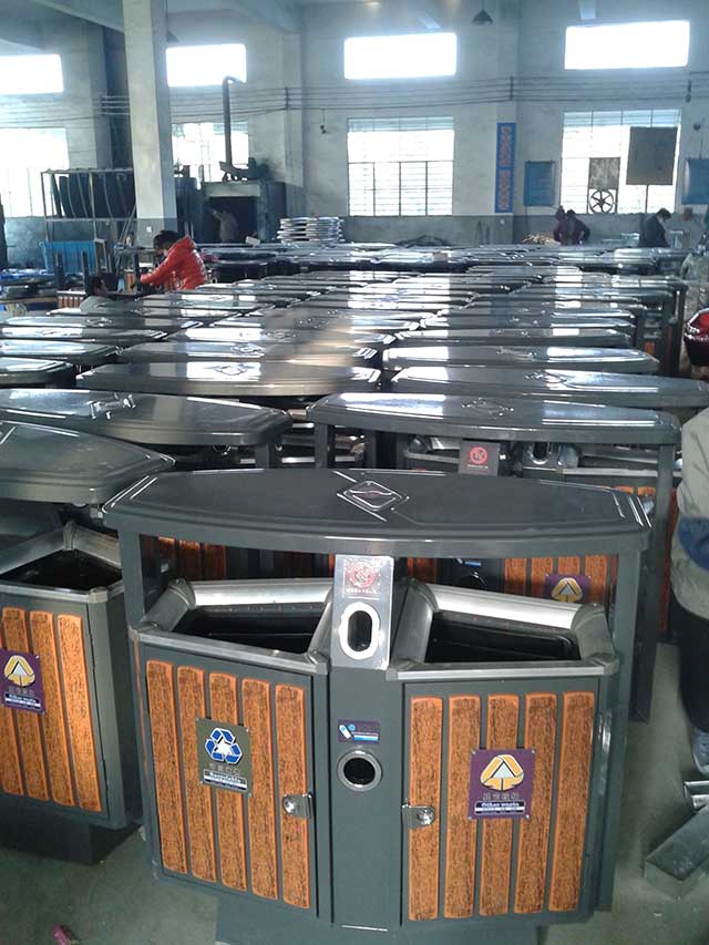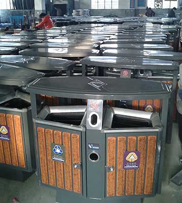 • 產品材質:欣方圳塑木環保垃圾桶采用新型的剪鈑下料,折彎、沖壓、焊接、打磨、等工藝: 表面經過除油、噴砂防銹處理后,再進行酸洗磷化處理;表面清理干燥后整體進行靜電噴涂,涂層厚度達到 90um,經過流水線高溫固化爐固化后再出爐冷卻,加工后的塑粉附著力強,不易剝落;