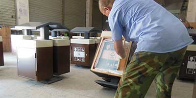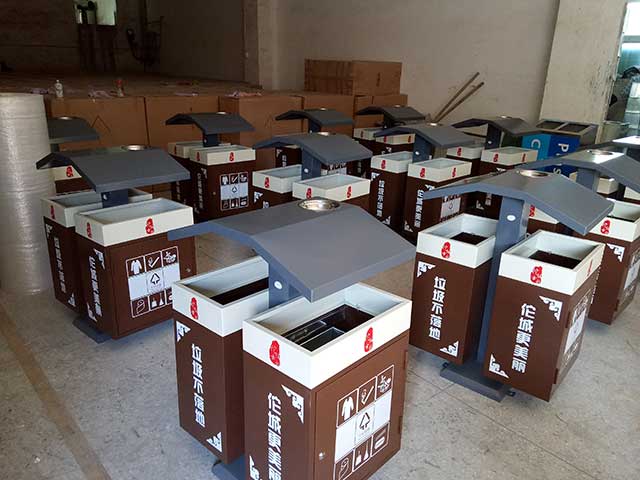 欣方圳鋼制戶外四分類垃圾桶產(chǎn)品一律用室外粉靜電噴塑,經(jīng)過180°的高溫使垃圾桶顏色持久不變,亮麗如新