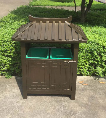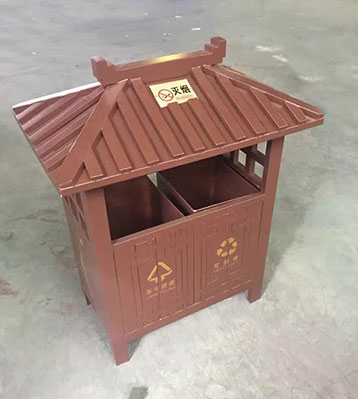 景區古典鋼制分類垃圾桶,桶頭部分屋檐造型,造型優美、古色古香。
