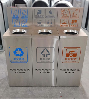 • 產品材質:不銹鋼生活垃圾分類收集桶采用201#,202#,304#優質不銹鋼材料模壓成型,堅固耐用,不易破損;耐火安全,抗高低溫,適合各種惡劣氣候條件;金屬亮澤,高雅美觀,廣泛適用于各種場所;內外表面光潔,減少垃圾殘留,易于清潔;配置鍍鋅板內桶,便于垃圾清倒;