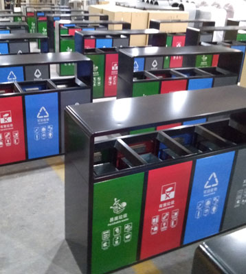 戶外金屬烤漆四分類果皮箱批量生產圖