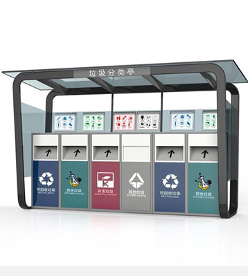 • 使用范圍:四分類垃圾收集亭可帶太陽能夜間照明,LED屏,投口自動感應,稱重,滿溢短信提醒等功能。高檔亮麗,是物業小區、居民樓院、社區街道、單位庭院或街面商鋪等戶外垃圾分類收集場所擺放的首選。
