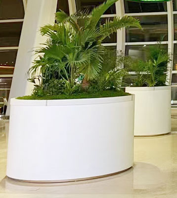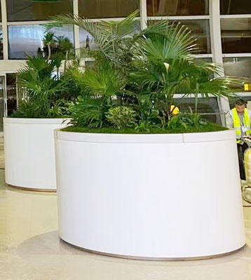 • 產品材質:深圳機場不銹鋼大花箱304加厚材質制作不易變形,表面做白色烤漆,沿口做80*100mm白色半透明磨砂亞克力,內藏燈帶,種植景觀花草夜間發光效果也很美,金屬亮澤,內外表面光潔,易于清潔,表面可做電鍍壓紋、水鍍、蝕刻、納米鎳、無氰堿性光亮鍍銅工藝效果,無指紋處理高檔大氣;